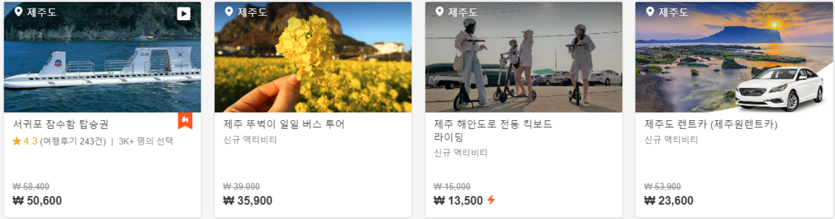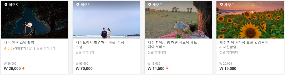 제주도에서 이용할 수 있는 다양한 액티비티에 추억을 소장할 수 있는 스냅촬영까지. 렌트카가 없는 이를 위한 버스투어 상품도 있고 제주도에서만 즐길 수 있는 DIY클래스까지 다양한 상품을 확인할 수 있다. 여기에 추가로 제주도 여행 꿀팁 정보까지!