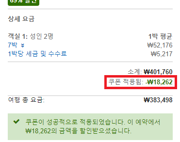익스피디아는 이렇게 최종 호텔 가격이 보이는 곳 아래에 할인코드를 입력할 수 있는 칸이 있다. 사실 현실적으로 모든 호텔이 익스피디아의 5월 호텔 할인이벤트에 참여하는 것은 아니지만 그래도 꽤 많은 호텔들이 참여하고 있어 생각보다 유용하게 사용이 가능하다.