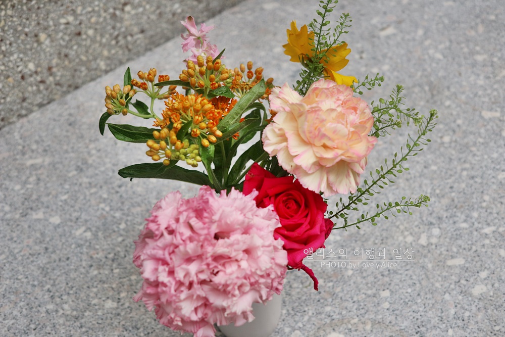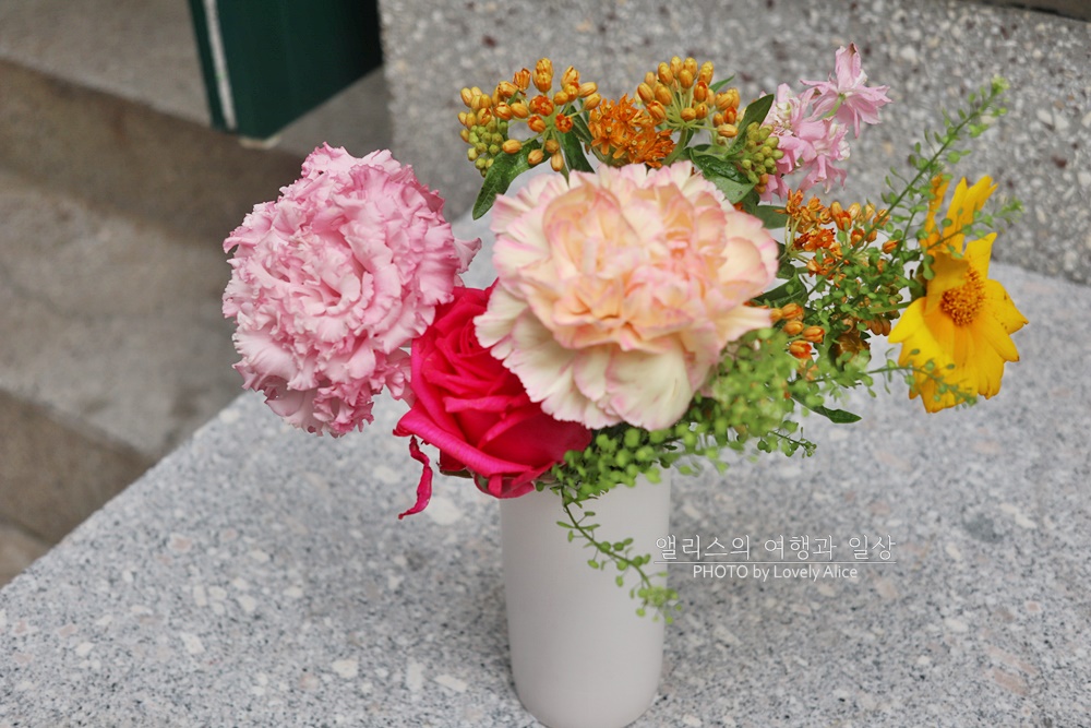 꽃다발을 꺼내어서 꽃을 하나씩 분리해주고 줄기 상태를 확인했다. 가위 손질을 해야 하는 것도 있지만 그렇지 않은 줄기들, 그러니까 배송된 채로 그대로 두어도 괜찮은 꽃 줄기들이 있었다. 최대한 살려서 꽃병에 플라워 푸드와 물의 비율을 맞춰서 채운 뒤 꽃을 꽂았다. 그리고 마당에 두었다. 따뜻한 햇살을 받으면 배송되는 동안 상자에 있던 꽃들이 화사하게 기지개를 펼 수 있으니까!