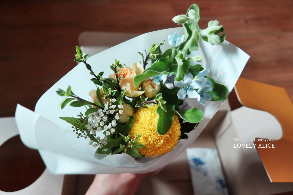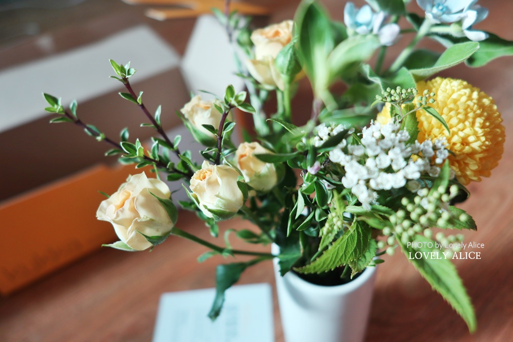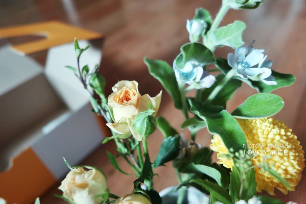 노랗기만 했다면 조금 심심했을지도 모른다. 하지만 여기에 블루옥시가 함께하니 전체적인 분위기가 더 상큼한 것 같다. 꾸까를 통해서 약 2년 가까이 정기구독 하면서 알게 된 여러 꽃중에 하나가 블루옥시다. 파스텔 톤의 하늘색 꽃잎이 예쁜 작은 꽃.