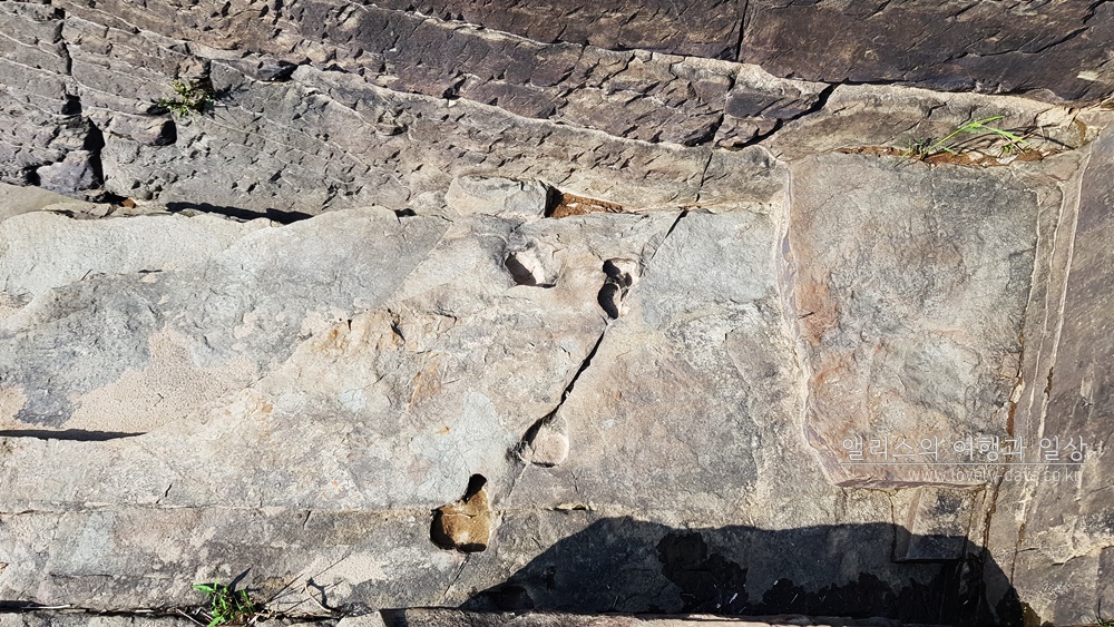 자세히보면 일정한 길 모양을 따라서 어슴프레 둥근 형태의 자국등을 볼 수 있는 데 그것이 바로 공룡 발자국 화석이라고 한다. 약 1억년전인 백악기로 추정되는 초식공룡의 발자국이라고 하니 신기방기 ^^