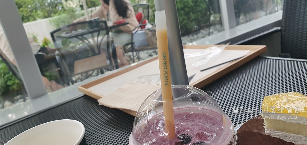 온실리움이라는 카페답게, 이 카페가 꾸며진 컨셉에 맞게, 빨대는 플라스틱이 아니라는 점, 여기에 특수하게 추가로 컵홀더를 사용하지 않고 컵 자체가 미끄러지지 않도록 독특한 문양을 넣은 것이 특징이었다.