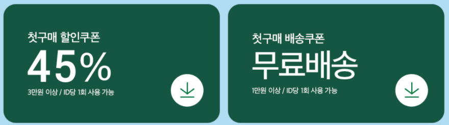 이건 달마다 약간씩 달라지는 부분이지만, 추가로 3만원 이상 구매시 45% 할인쿠폰 + 무료배송 쿠폰이 주어진다.