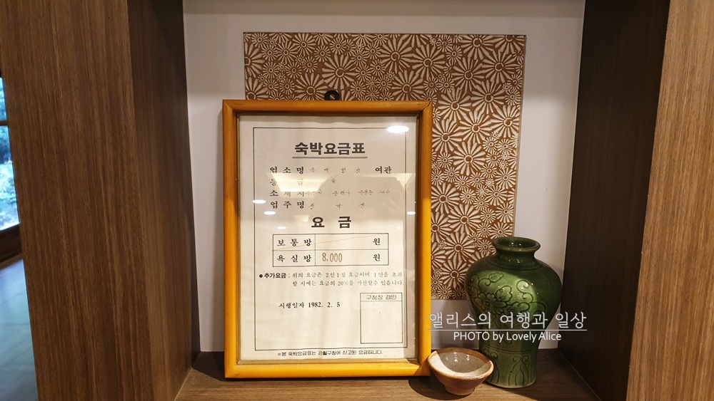 동래 온천의 물이 좋아 온천으로 유명하기 시작하면서 일제강점기 시절에 여기저기서 온천관련 휴양/여가 시설등이 본격적으로 들어섰다. 동래별장은 일본 왕족이 머물 때 온천을 즐길 수 있는 탕을 만들었고 차후 이 건물은 그렇게 온천 숙박시설로 사용되기 시작했다. 그래서인지 아직도 남아있는 아주아주 오래 전 숙박요금표가 눈에 띄었다. 그 당시에 8,000원. 그 당시 기준으로 적은 비용은 아닐듯.
