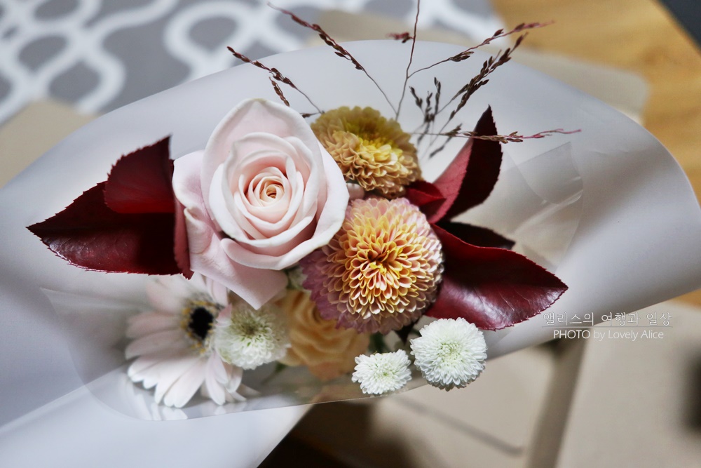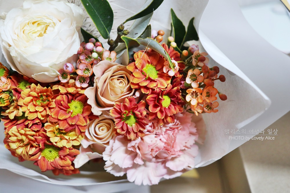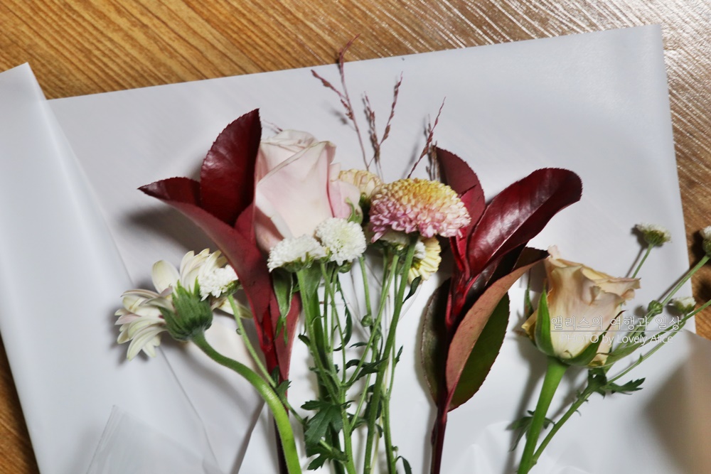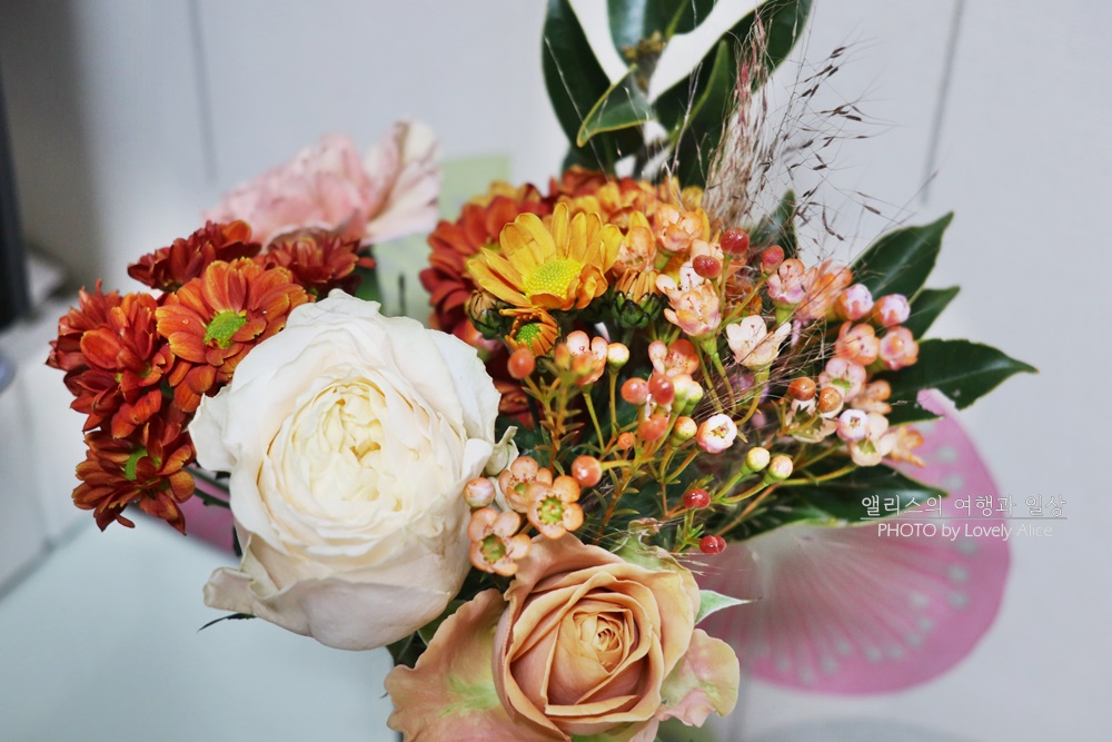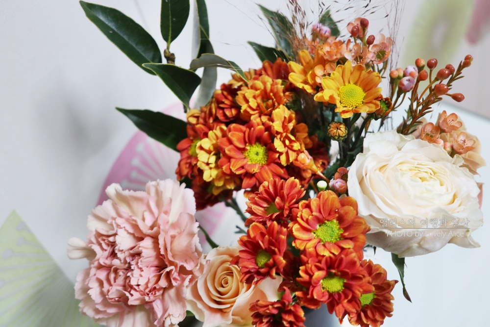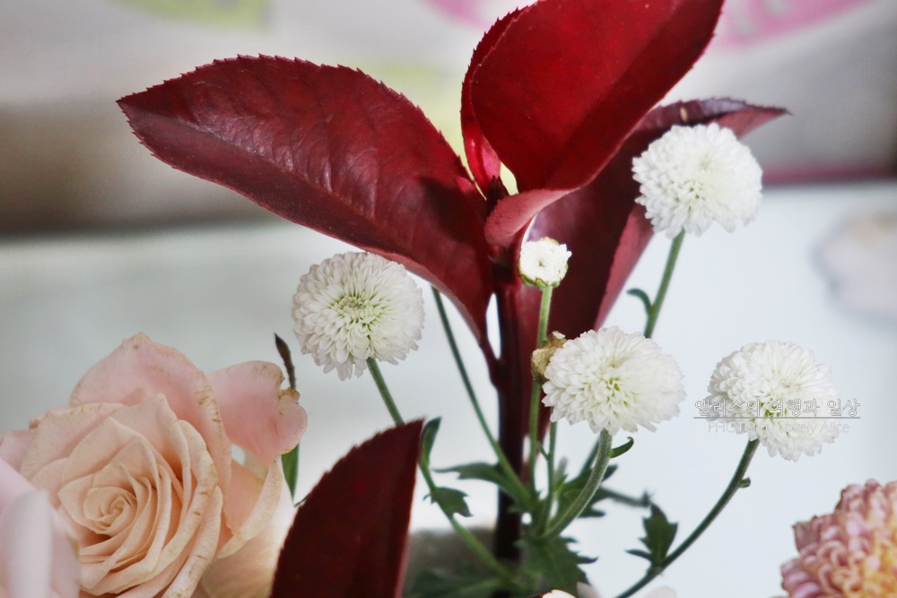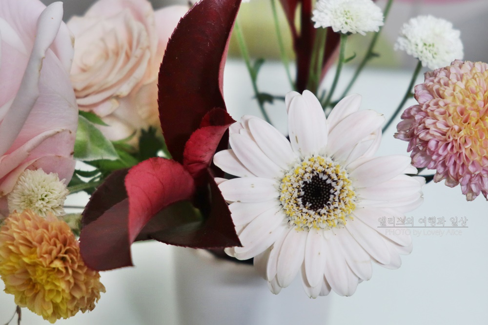 장미와 미니거베라의 색상이 깔맞춤이다. 여기에 퐁퐁 소국은 귀여운 매력까지. 의외로 홍가시가 이렇게 포인트가 될 줄은 상상을 못했다. 이런 의외의 매력은 전문가의 손에서 탄생하는 법 (나는 상상도 못할 조합이다.)