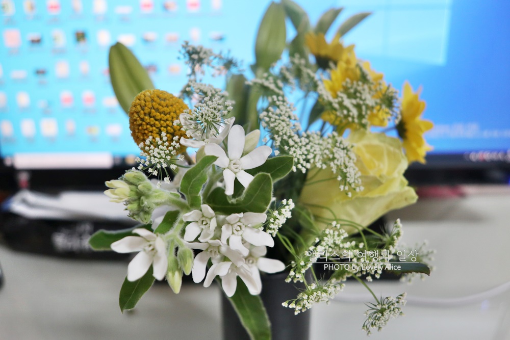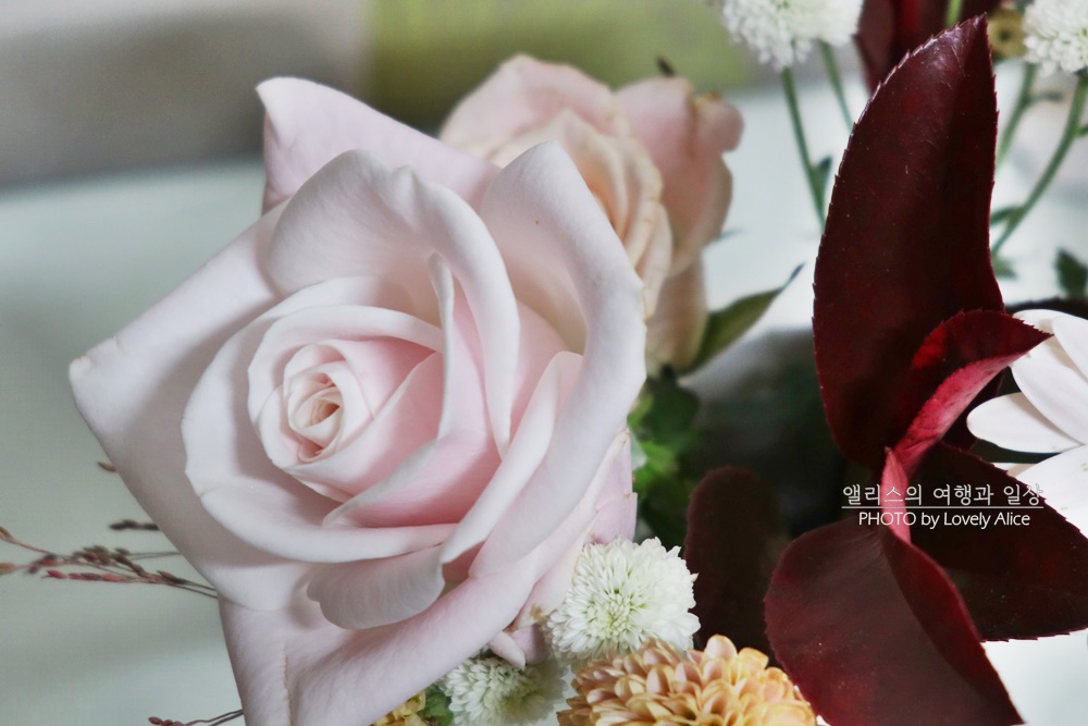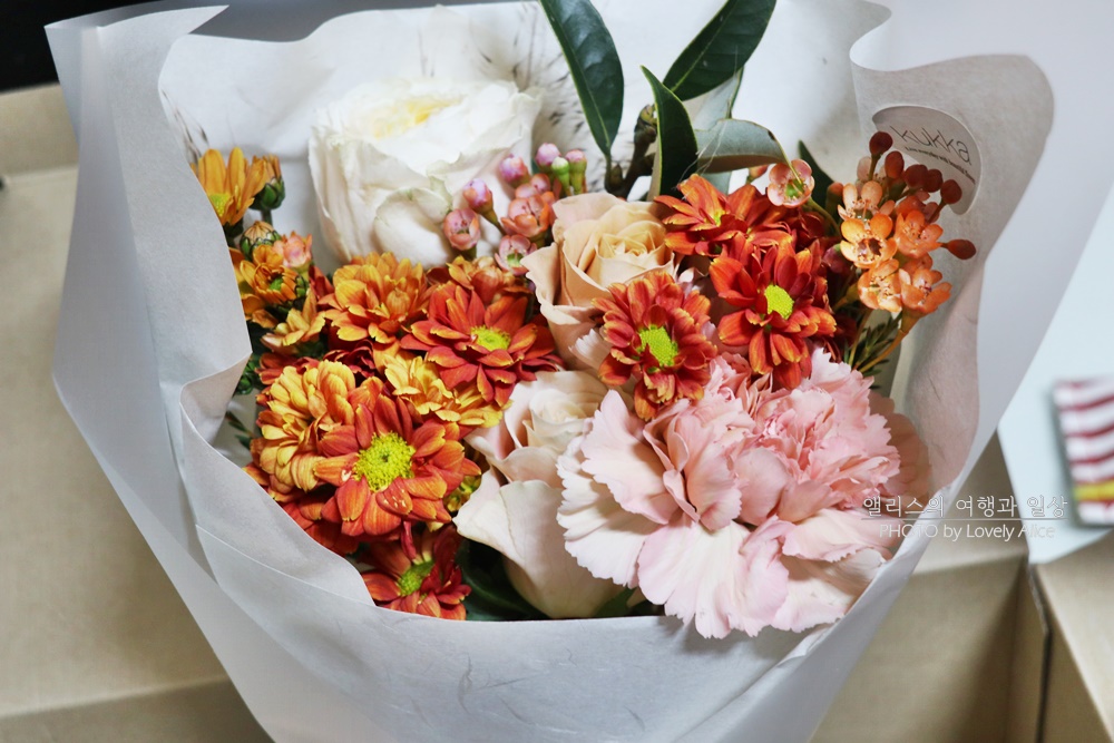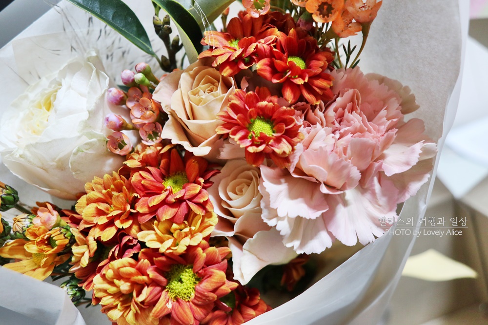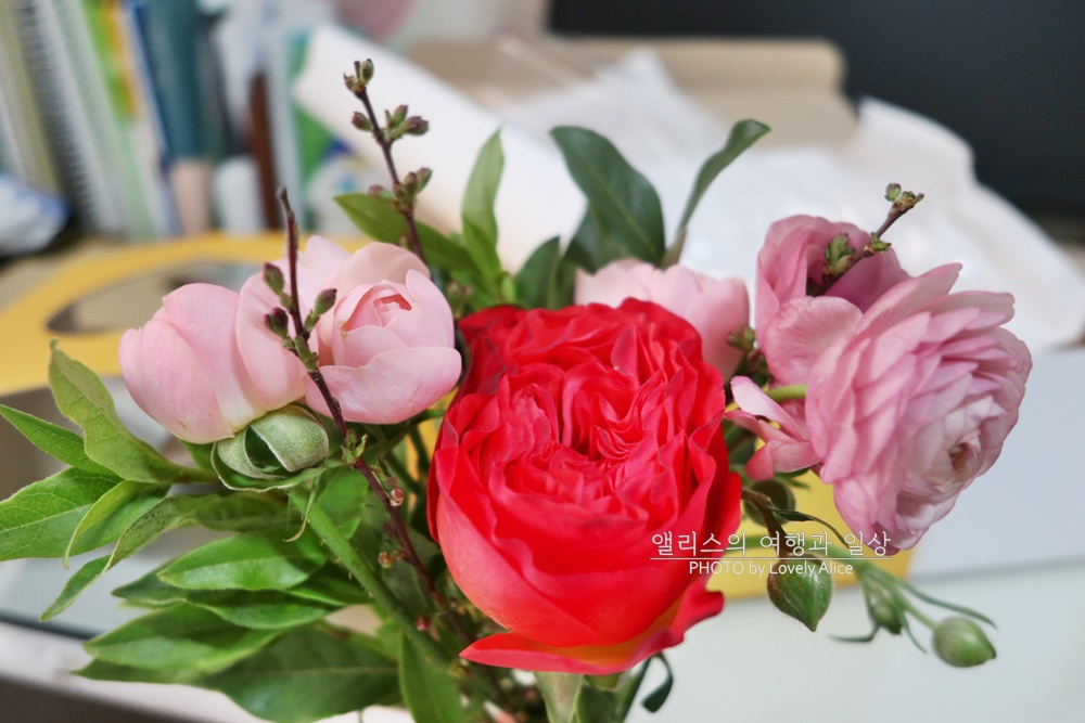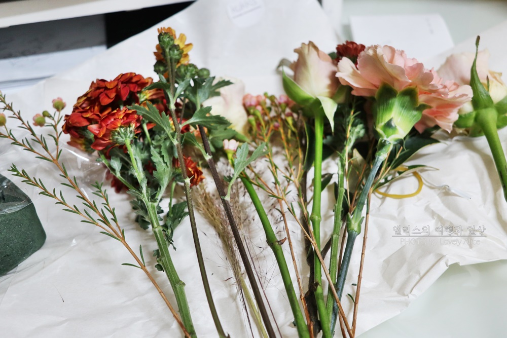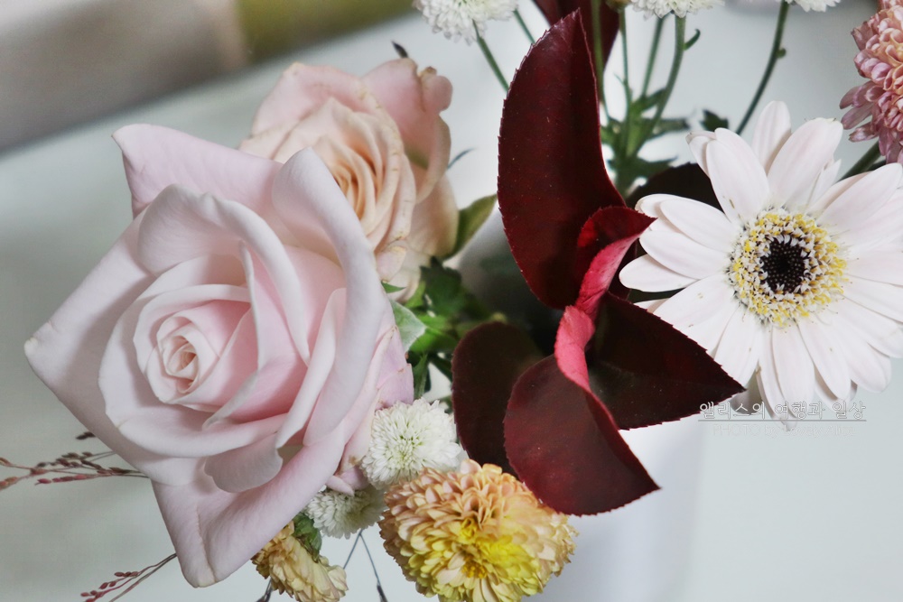 장미와 미니거베라의 색상이 깔맞춤이다. 여기에 퐁퐁 소국은 귀여운 매력까지. 의외로 홍가시가 이렇게 포인트가 될 줄은 상상을 못했다. 이런 의외의 매력은 전문가의 손에서 탄생하는 법 (나는 상상도 못할 조합이다.)