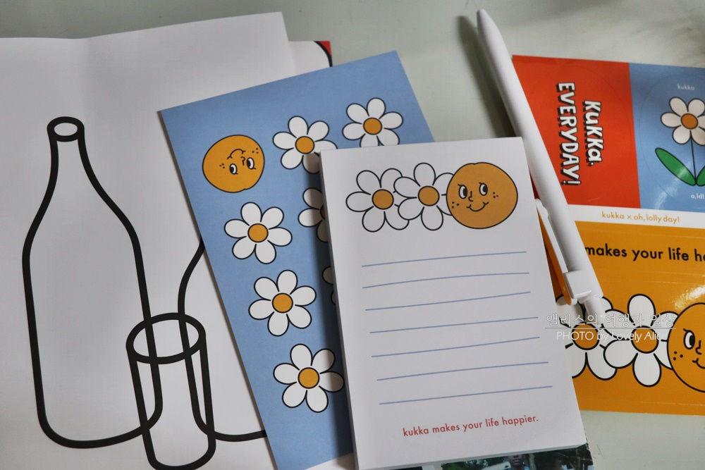 그리고 오롤리 콜라보 해피키트는 엽서/ 스티커/ 볼펜/ 메모지/ 포스터2종/ PVC 파우치