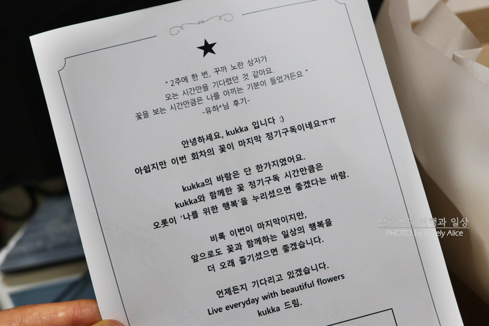 카드 설명이 있는데 어디간건지.... 내가 구독한 프로그램의 마지막 꽃배달이었기에, 아쉬운 마음을 담은 편지와 함께 추가 할인코드도 알려주었다. 물론! 나는 사전에 미리 재구독을 했으니 2주가 지난 뒤 다시 꽃을 받을 예정이지만, 화려한 꽃다발에 아쉬운 마음과 꽃의 싱그러움을 받을 수 있는 또 다른 기분이 들긴 했다.