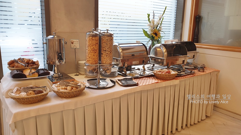 조식당이 1층이었던가 2층이었던가... 아무튼 엘리베이터를 타고 내려아갸했는데 생각보다 조식당이 넓었다. 물론 그만큼 투숙객이 매우 적어서 정말 휑한 느낌이 조금 들긴 했지만.. 그래도 사람들이 많이 몰리는 시간대에도 여유롭게 조식을 이용할 수 있을만큼 넓다는 생각이 들었다.