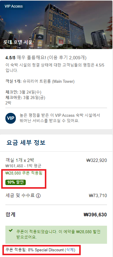 예를 들어 롯데호텔 서울을 예약한다고 하자이 경우 익스피디아에서 예약하면 기본 10%할인이 적용되지만추가로 8% 할인코드를 적용할 수 있어서 28,080원 더 할인받을 수 있다.