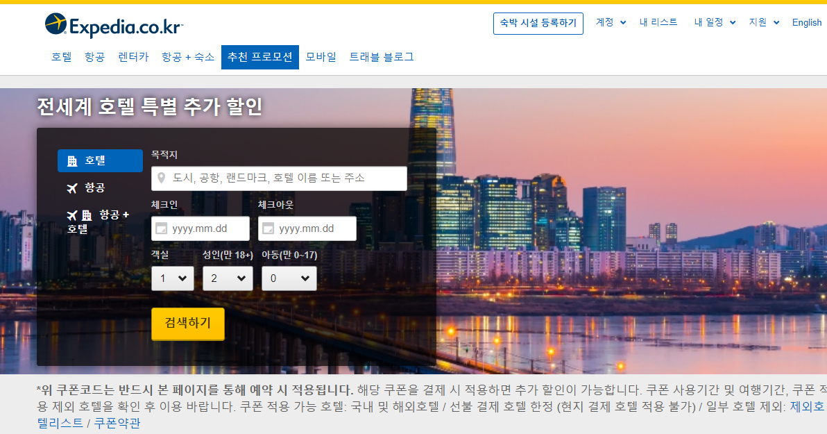 익스피디아 호텔 특별 추가할인 페이지에서 원하는 호텔을 검색한다.