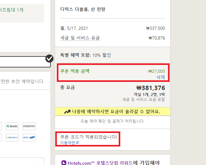 각 카드사와 호텔스닷컴이 연계하여 호텔 예약시 이용 가능한 할인코드가 다양하다. 8%~15% 까지 자신이 소지한 카드 중 해당하는 할인코드가 있다면 호텔 예약시 활용하자. 할인율이 꽤 높기 때문에 어디서 예약하든 최저가 예약이 가능하다.