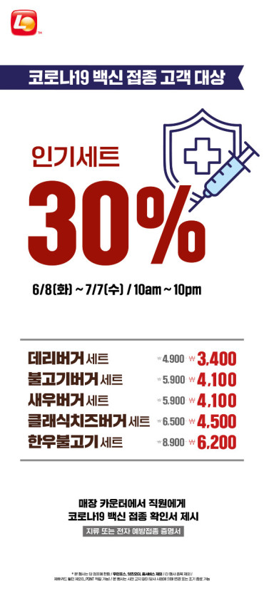7월 7일까지 전국 약 350개 직·가맹점에서 코로나19 예방 접종 증명서를 매장 카운터에 제시하는 고객에게 인기 메뉴를 약 30% 할인 판매 (한우불고기버거, 클래식치즈버거, 새우버거, 불고기버거, 데리버거 등 총 5종의 메뉴가 대상)