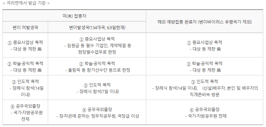 셋째, 예방접종을 모두 완료한 재외국민등이 직계가족 방문시, 그리고 기업인이 기업활동을 위해 격리면제가 필요할 경우 격리면제서를 발급받아 국내 입국시 격리면제가 가능하다. 이 경우 꼭 기업인 뿐만 아니라, 사업상 목적, 학술/공익적 목적, 인도적 목적등 변이 바이러스가 발생하지 않은 국가에서 입국하는 입국자의 경우 격리면제서 신청이 가능하다.
