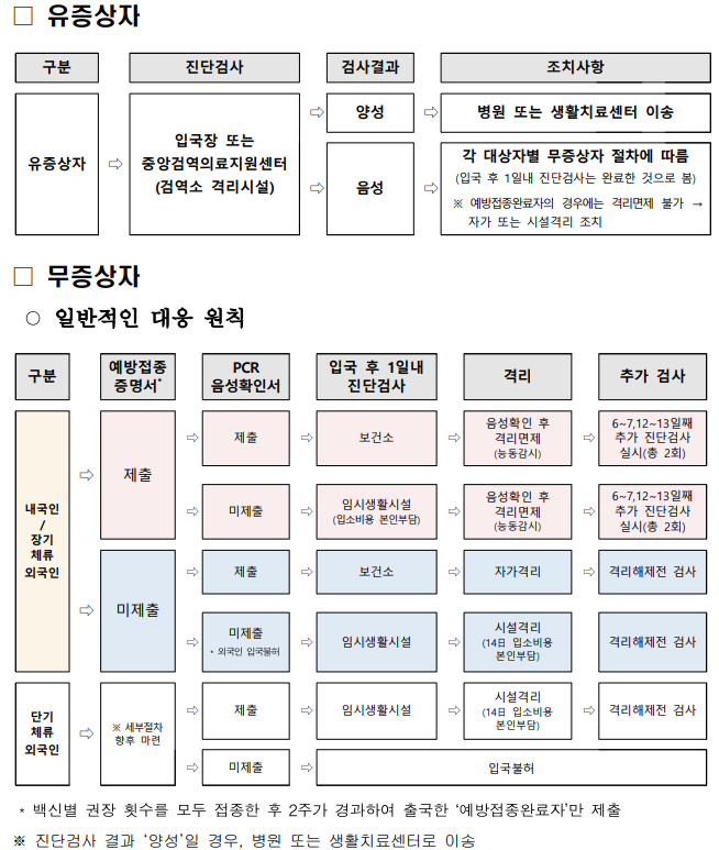 단, PCR 음성결과 제출시 자가격리, 그렇지 않을경우 시설격리(14일단 입소비용 자가부담)가 된다. 그리고 격리해제전 PCR 진단검사를 실시한다. (물론 이때도 결과는 음성이어야 함.) 외국인은 출발 기준 72시간내의 PCR 진단검사 결과지를 제출하지 않으면 입국 불가하다.