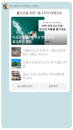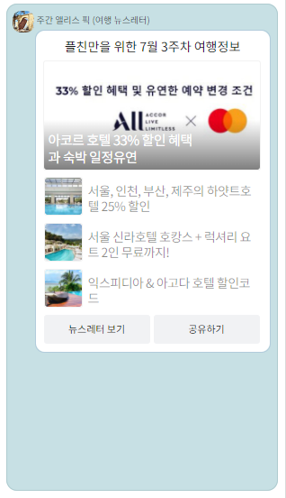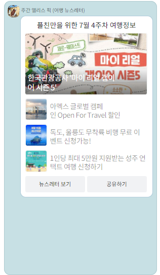 주1회 뉴스레터 + 주 1회 여행 프로모션 이렇게 카톡플친으로 발송됩니다