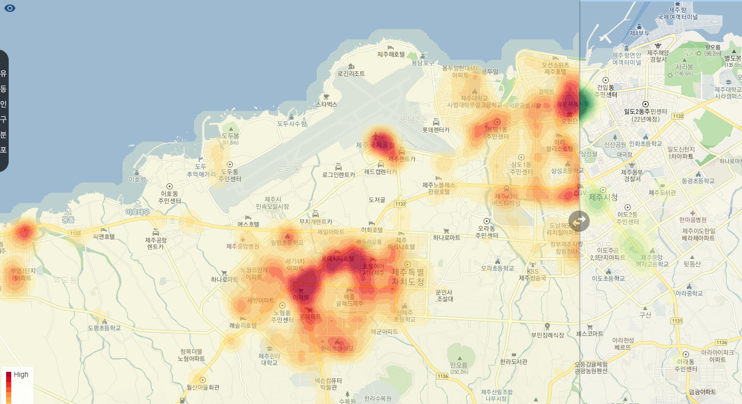 한국인이 가장 많이 사용하는 SKT 기지국의 데이터를 활용하여 분석, 제공하는 이 서비스는 제주도민과 관광객들의 성별, 연령별 지역 분포도를 5분 단위로 업데이트 하여 제공하기 때문에 굉장히 유용하다. 이 서비스를 활용하면 제주도민과 관광객들이 있는 곳, 최근 3시간동안 많이 증가한 곳을 확인할 수 있다.