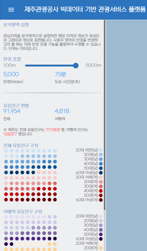 특히 본인이 보고 싶은 지역의 반경을 설정할 수 있고 그 설정된 지역에서 유동인구가 어떻게 구성되고 있는지 현재 유동인구 현황과 그 가운데 여행객들은 어느정도 되는지 확인 가능하다.