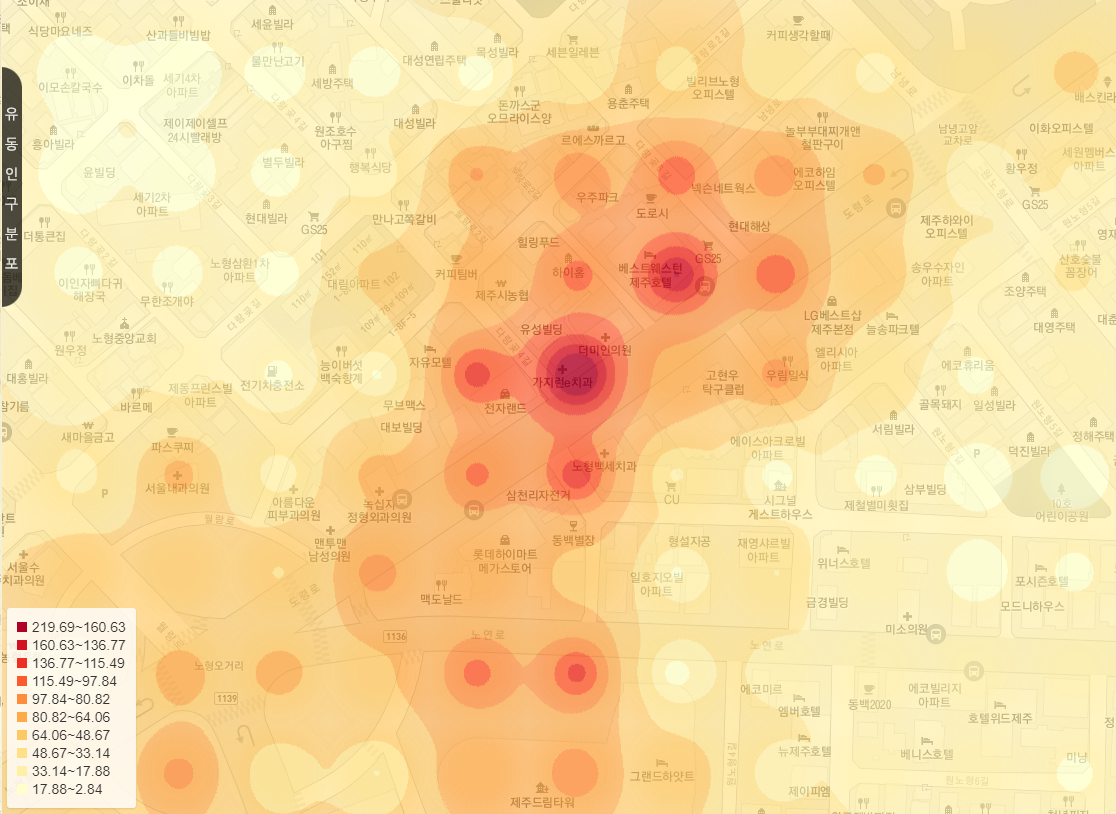 지도를 확대할 수록 유동인구 증감과 유동인구가 밀집한 지역을 구체적으로 확인할 수 있고 그 수도 구체적으로 확인 가능하다. 간편하게 확대할 수 있기 때문에 원하는 지역을 볼 수 있고 명칭과 주소로 손쉽고 정확하게 확인 가능하다.