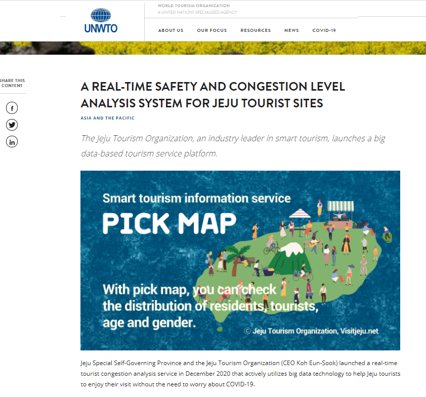 혼잡/밀접한 정보를 빅데이터로 실신간 전송, 제공함으로써 코로나 19를 극복하고 개별관광객들의 여행을 보다 안전하게 할 수 있도록 한다는 점에서 세계관광기구(UNWTO) 공식 홈페이지에 소개되었다. (▶ 기사 자세히 보기)