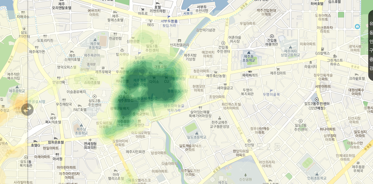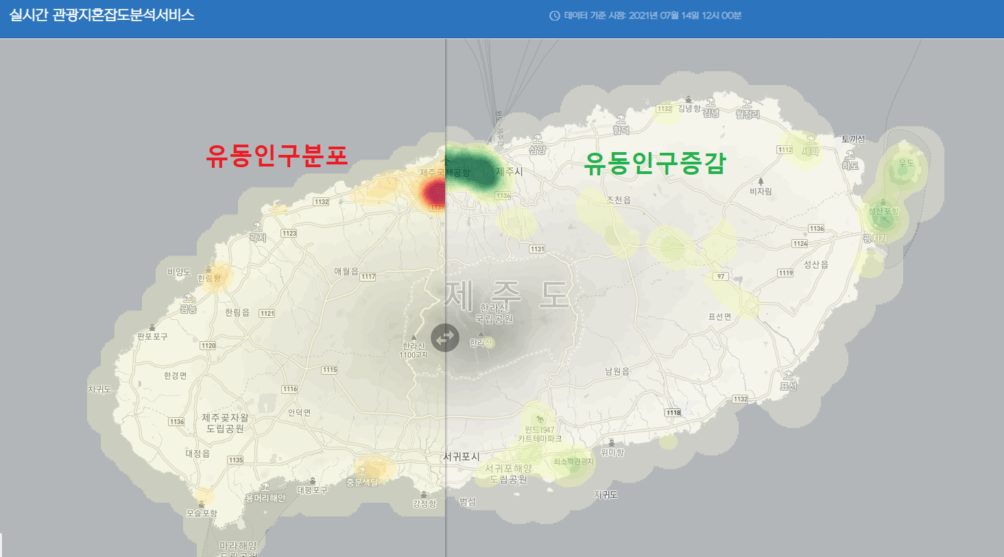 한국인이 가장 많이 사용하는 SKT 기지국의 데이터를 활용하여 분석, 제공하는 이 서비스는 제주도민과 관광객들의 성별, 연령별 지역 분포도를 5분 단위로 업데이트 하여 제공하기 때문에 굉장히 유용하다. 이 서비스를 활용하면 제주도민과 관광객들이 있는 곳, 최근 3시간동안 많이 증가한 곳을 확인할 수 있다.