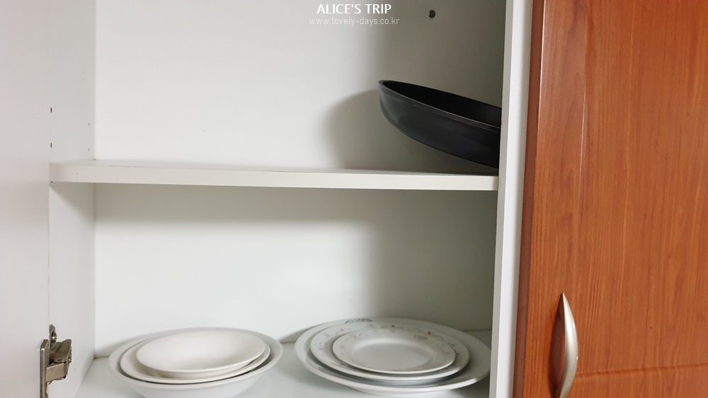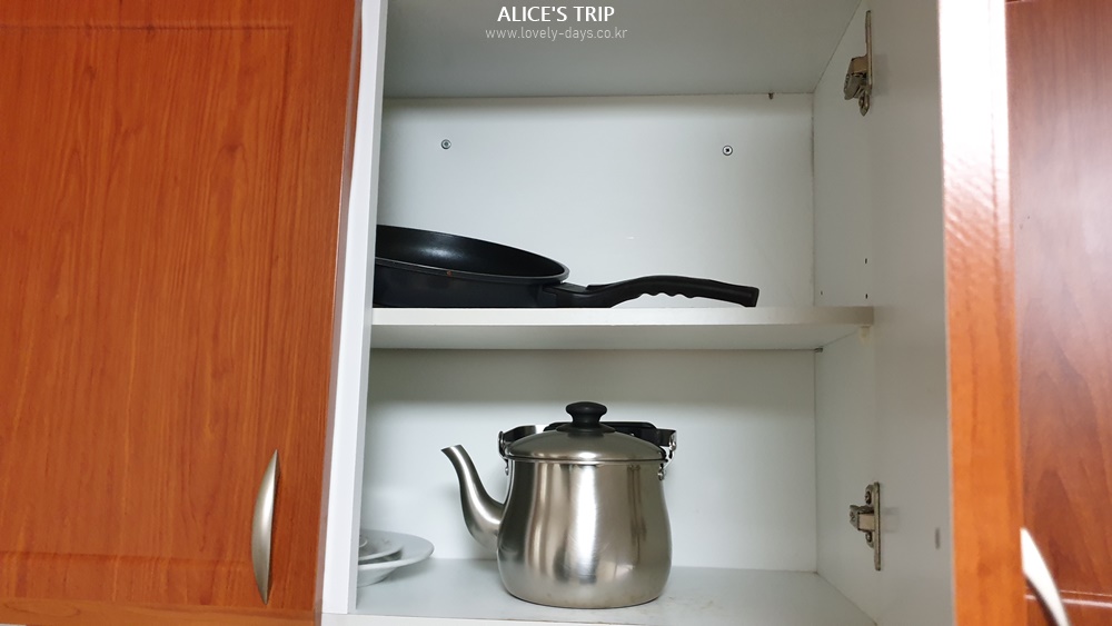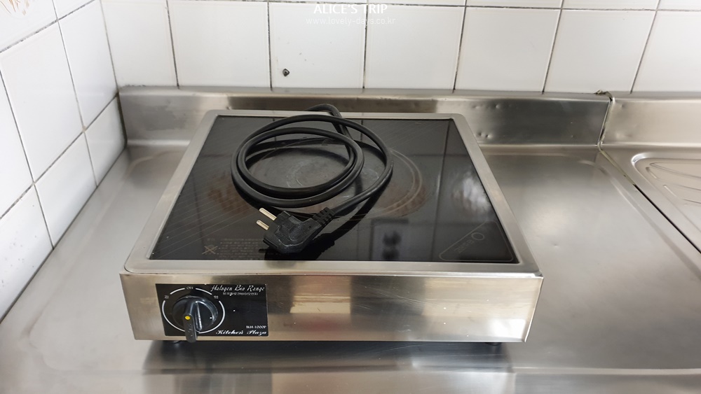 부엌이 따로 있으므로 사용할 수 있는 집기들이 준비되어있다. 생각보다 집기들이 많은 편이었고 다양해서 다양한 상황에 사용이 가능했다. 다만, 이곳에서 사용하는 전기레인지는 화력이 약했다. 후라이팬을 사용하는데도 생각보다 불이 약하고 조금 과열된다 싶으면 기계 스스로 화력을 낮추는 경향이 있었다. 그러므로 간단하게 데우거나 조리하는 것은 추천하는 편이지만 조금 불편할 수 있다는 점은 잊지 말자.