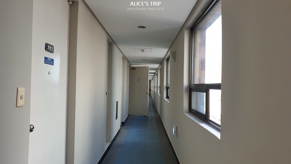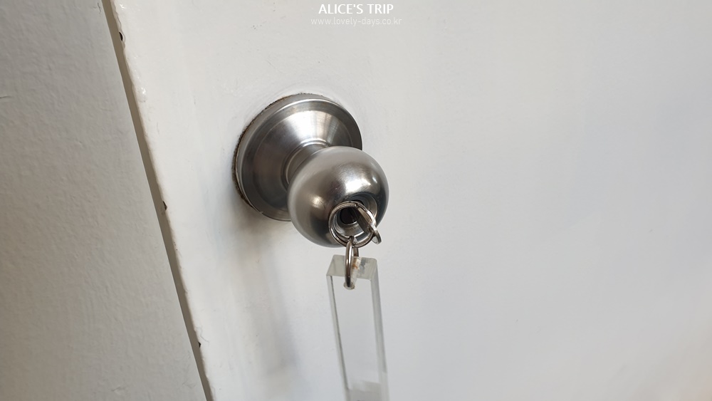 이 객실을 이용할 때는 이렇게 카드키가 아닌 열쇠를 이용해서 열어야 한다. 열쇠를 돌린 상태를 유지한 뒤 문을 열어야 하므로 한 손으로는 사용이 불편하긴 했다.