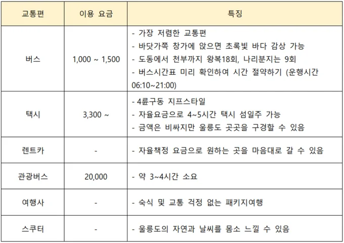 아래는 내가 직접 찾아본, 개인이 직접 예약하고 개인이 활용할 수 있는 울릉도 여행 상품을 정리했다.