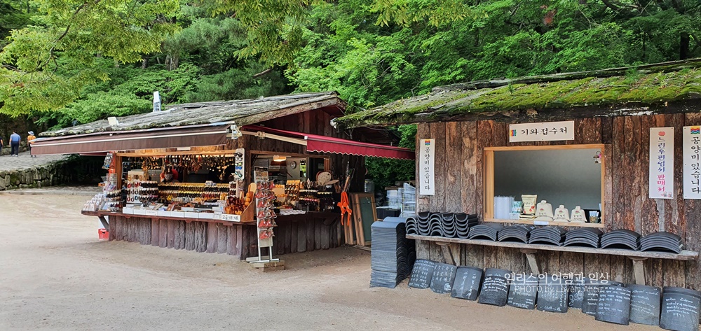 작은 기념품 가게와 함께 있는 문화재 해설안내
