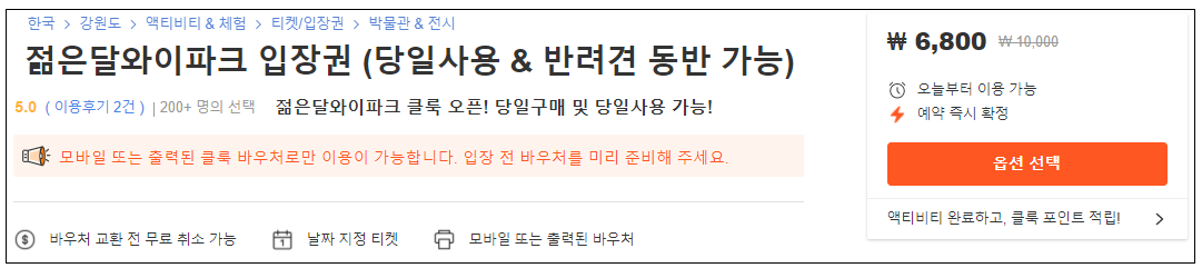 여기 클릭 후 젊은달 와이파크 입장권 구매시 결제시 1천원 즉시할인 (결제 전 쿠폰코드: 젊은달와이파크도클룩 입력 필수!)