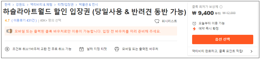 : 여기(온라인 최저가) 클릭 시 성인 9,400원, 어린이 8,800원에 예약가능하다. 입장시 QR코드로 간편 입장 가능