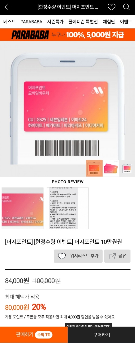③ 머지머니 10만원 → (20% 할인) 84,000원권 구매