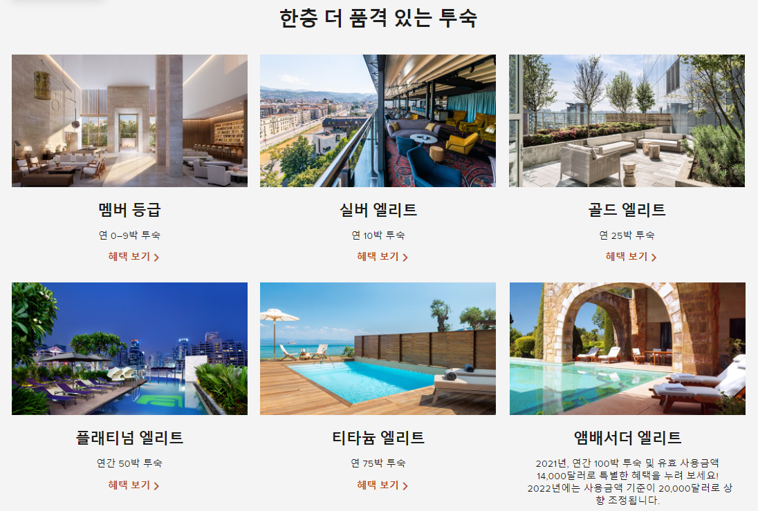 - 참고: 메리어트 본보이™ 골드 등급은 메리어트 본보이™ 더 베스트 카드 발급 및 갱신 시 매년 자동부여/ 메리어트 본보이™ 골드 엘리트 등급은 카드 발급일 기준으로 최대 4~6주 내에, 플래티늄 엘리트 등급은 연회비 청구 주기 내 이용 실적 기준 달성 시 청구 결제일 이후 4~6주내에 본인 메리어트 계정에 자동 반영