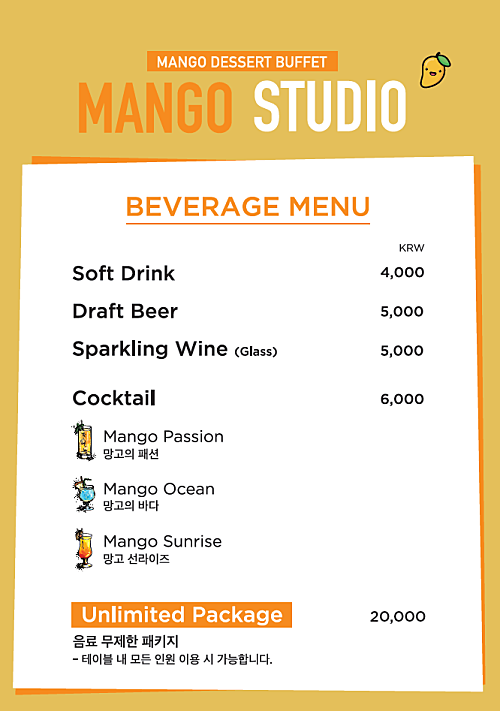 - 망고 뷔페는 주말 및 공휴일에 한해 이용 가능 (이용 시간은 2시간 제한)