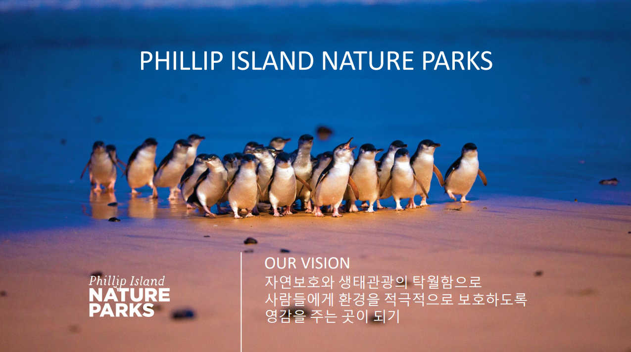 호주의 다양한 야생동물을 볼 수 있는 곳이자, 시원한 기후에서 생산된 훌륭한 와인과 신선한 유기농 채소등을 맛볼 수 있는 곳이기도 합니다. 물론 아름다운 해안선을 따라 서핑을 할 수 있고 매년 그랑프리 서킷이 열리는 자동차 경주도 관람할 수 있죠. 이 필립 아일랜드에는 네이처 파크가 있습니다. 자연보호와 생태관광의 탁월함으로 사람들에게 환경을 적극적으로 보호하도록 영감을 주는 곳이기도 하죠. 이곳에서 여러 명소가 있는데요,