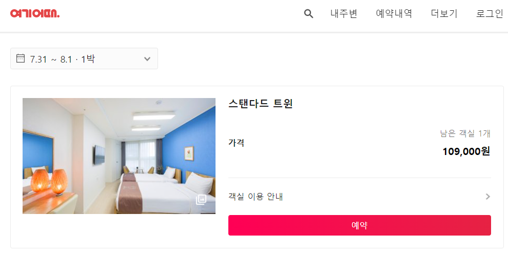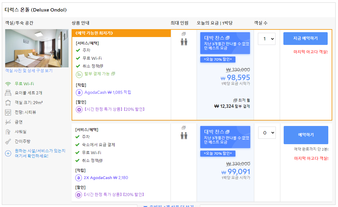 스탠다드룸 트윈룸과 디럭스 온돌으로 10만원대에 예약 가능하다.