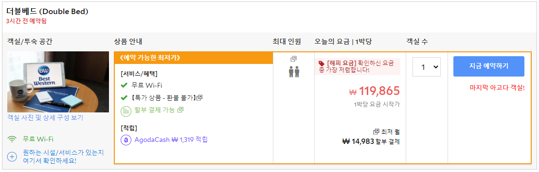가장 저렴한 예약사이트는 이 글을 작성하는 시점으로는 트립닷컴과 아고다(베스트 웨스턴 해운대 호텔 자세히 보기)이다. 가격만 보면 트립닷컴이 조금 더 저렴하지만 환불불가 조건이고, 아고다의 경우 몇천원 더 높지만 환불가능조건이니 이 부분 따지는 것이 좋다.