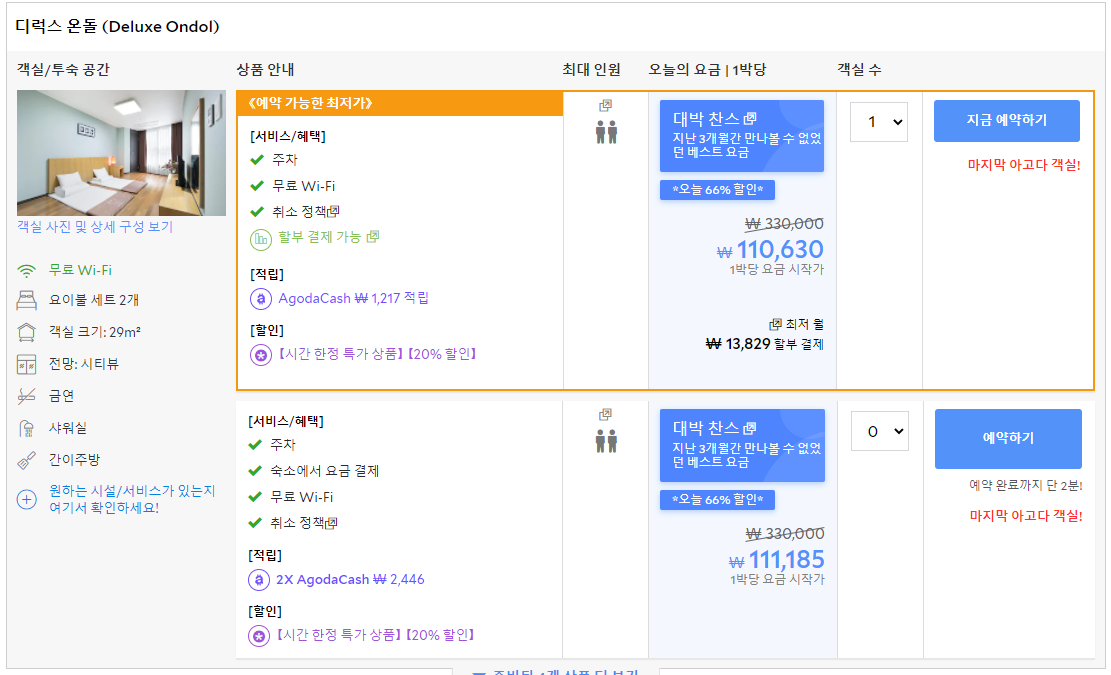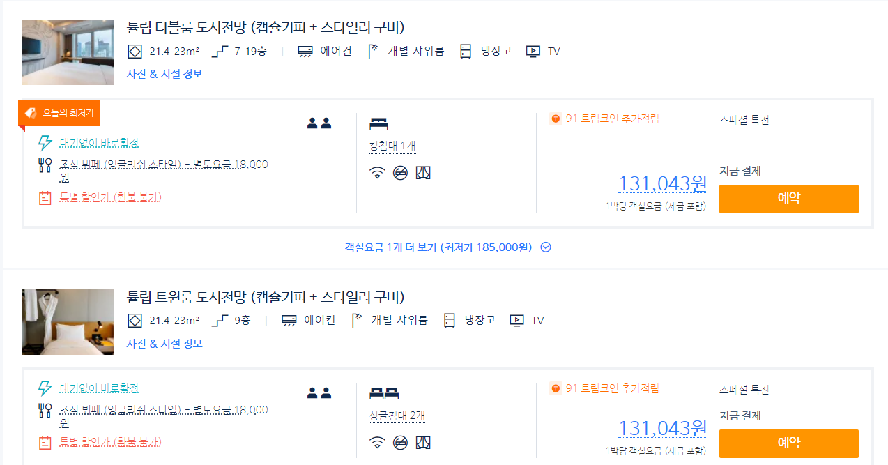 튤립 트윈룸/더블룸 도시전망으로 13만원대에 예약 가능하다.