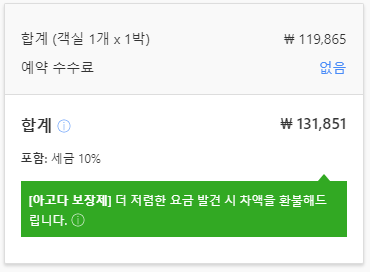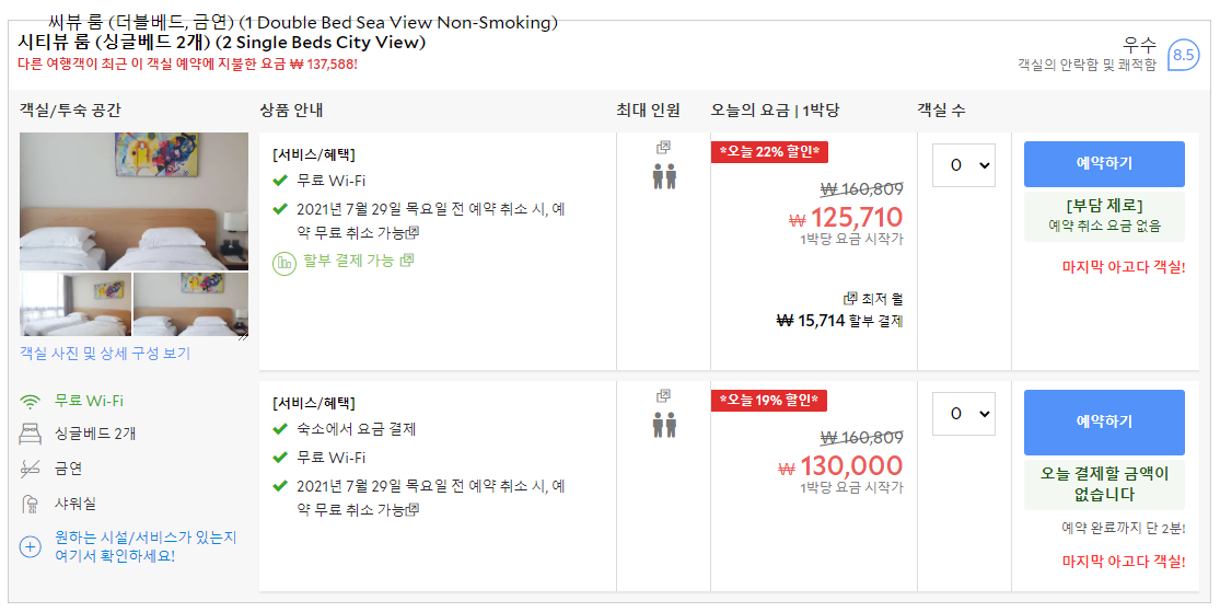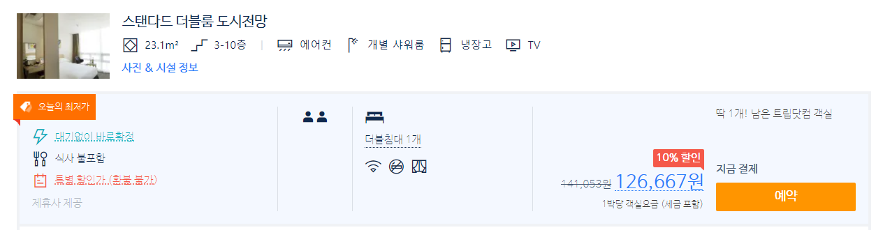 시티뷰 트윈룸, 더블룸으로 13만원대에 예약 가능하다. (세금포함하면 최저가가 131,851원)이다.