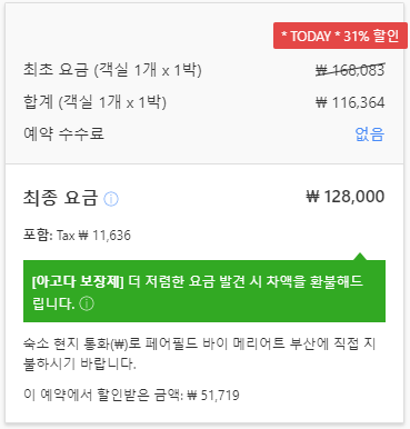 가장 저렴한 예약사이트는 이 글을 작성하는 시점으로는 트립닷컴과 아고다(페어필드 바이 메리어트 부산 자세히 보기)이다. 가격은 트립닷컴이 조금 더 저렴하고 환불가능조건으로 유리하다. 단, 아고다와 2천원도 차이 나지 않으며, 아고다 멤버쉽 등급이 좋다면, 환불불가 조건으로 조금 더 저렴할 수 있으니 직접 확인해보시길 추천한다.
