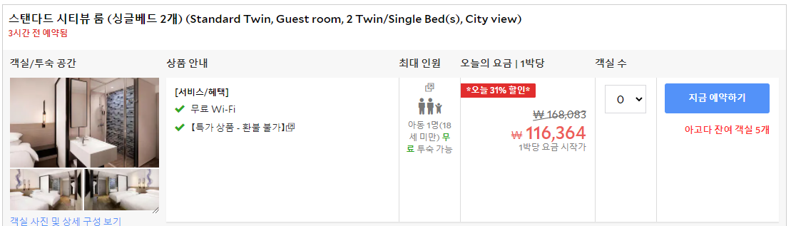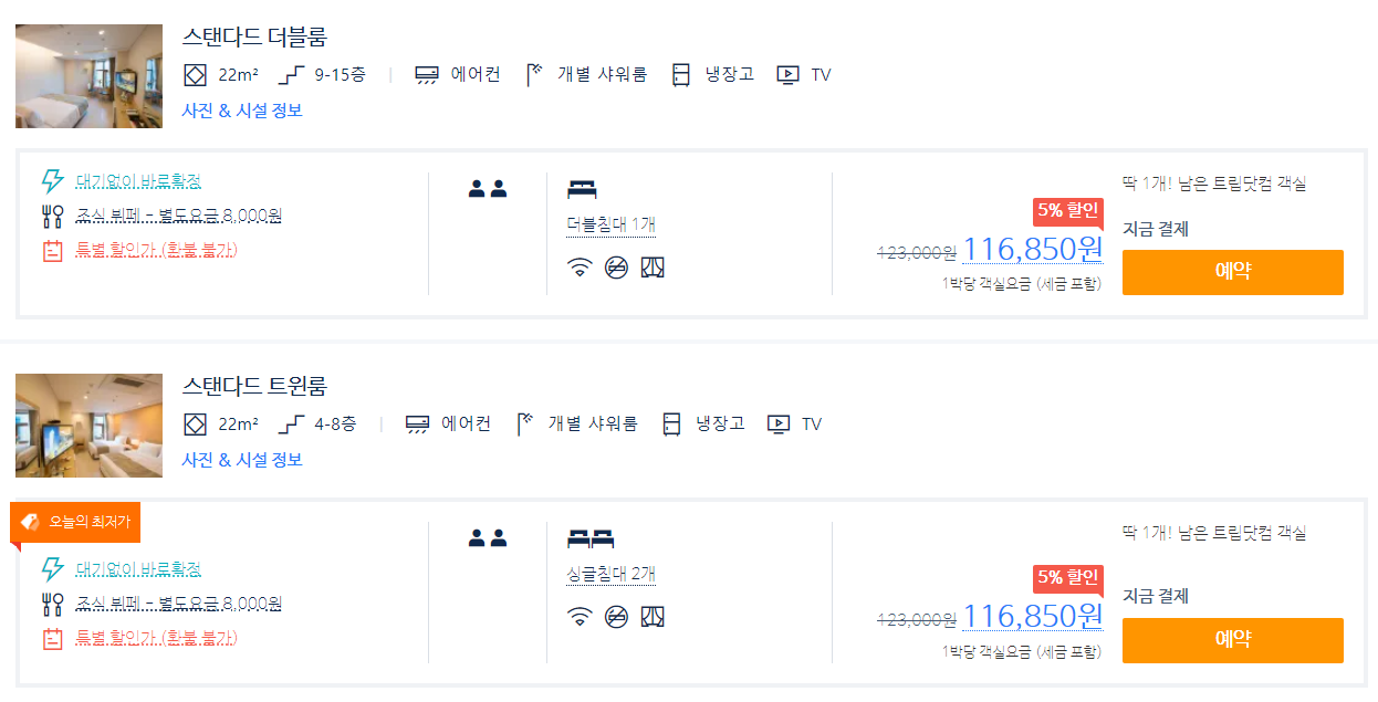 스탠다드룸(시티뷰) 트윈룸, 더블룸으로 12만원대에 예약 가능하다.