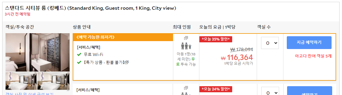 가장 저렴한 예약사이트는 이 글을 작성하는 시점으로는 트립닷컴아고다(베스트 웨스턴 해운대 호텔 자세히 보기)이다. 가격만 보면 트립닷컴이 조금 더 저렴하지만 환불불가 조건이고, 아고다의 경우 몇천원 더 높지만 환불가능조건이니 이 부분 따지는 것이 좋다.
