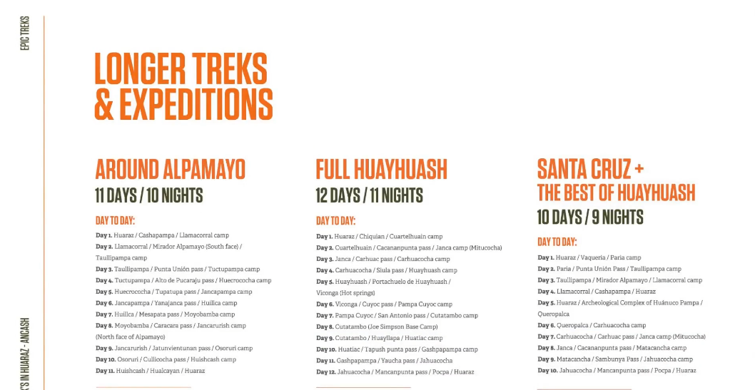 이 지역에 있는 아름다운 국립공원 트래킹 코스는 날짜를 만들기 나름이겠지만 (코스와 날짜가 거의 취향껏 제한 없이 조합 가능) 최소한 그래도, 정말 최소한의 일정으로 움직이고 트래킹 해야 한다면 적어도 "3박 4일"은 트래킹으로 코스로 잡기를 잉카 트레일과 페루 안데스 산맥에서 트레킹 투어 회사의 대표인 마틴 로메로가 추천합니다. (물론 그 이상이면 트래킹이 가능하면 더 좋겠죠!)