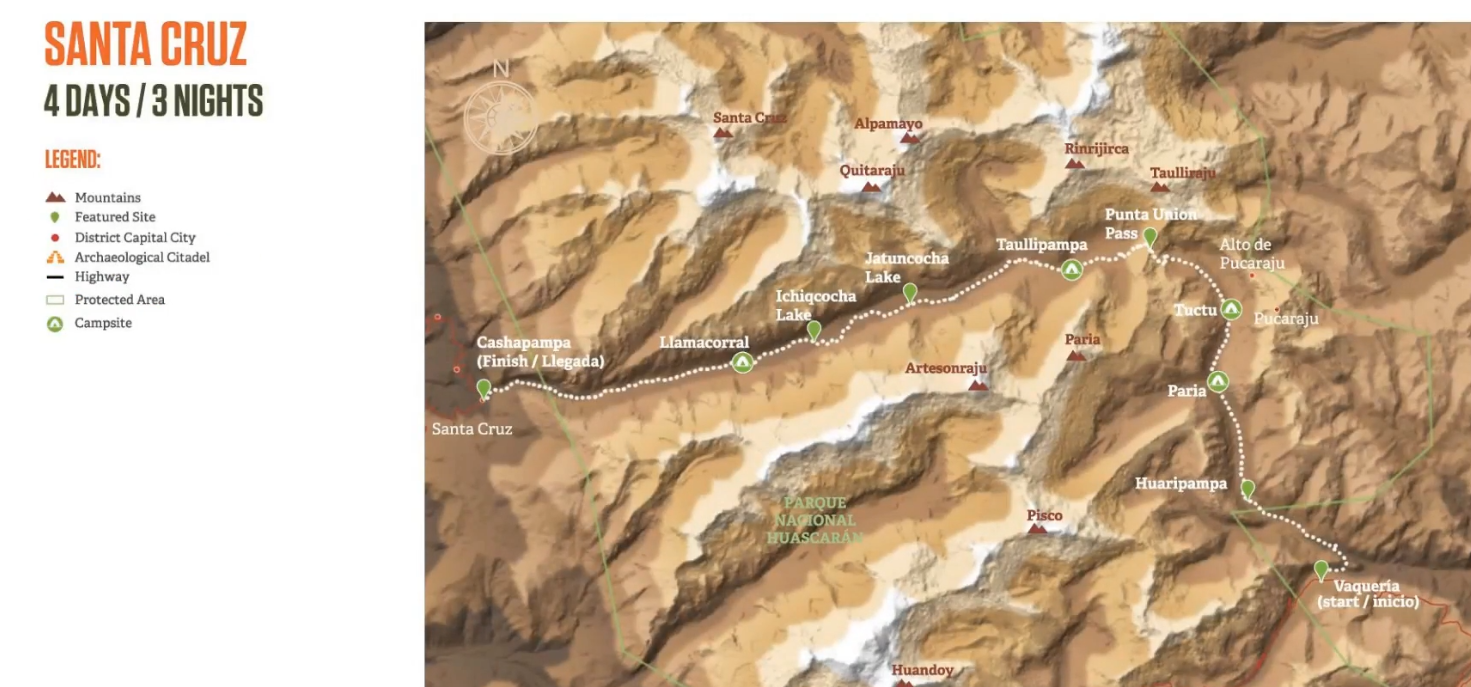3박 4일 코스 중 둘째 날 가파른 산을 올라가야 하므로 가장 힘든 날이고 이날 하루 동안 꽤 가파른 4750m 높은 산길을 지나면 내리막길을 조금 내려가게 됩니다. 하지만 이 과정에서 안데스 산맥의 동쪽에서 주요 계곡으로 물품을 운송하기 위한 경로를 트래킹 하게 됩니다. 이 경로는 콜럼버스 이전과 식민지 시대에 교통량이 많았던 지역인데요, 이 지역을 통해 깨끗한 빙하 호수와 밝은 흰색 빙하가 산타 크루즈 계곡의 아름다운 전망과 자연의 강렬한 색을 대비해 볼 수 있습니다. 셋째 날은 계속 좁아지는 협곡을 벗어나서 라마코랄(Llamacorral)로 하이킹을 합니다. 이 과정에서 산타 크루즈 계곡 사이로 보이는 아주 선명한 제이드(옥)색을 띠는 이 호수를 만날 수 있습니다. 그리고 마지막 날은 이른 아침에 출발 해 가파른 내리막길이지만 주요 계곡으로 천천히 굽이치는 길을 따라 카샤팜파(2944m/9658피트)에 도착합니다. 이후 와라즈(Huaraz)로 돌아가도록 개인 차량을 이용해서 이동하게 됩니다.