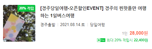 네이버와 경상북도가 만난 특별 이벤트. 네이버 국내 여행 서비스에서 경상북도 여행 상품을 결제하고 여행을 완료한 사람들에게는 최대 네이버 포인트 20%(결제금액 기준)를 적립해준다. 적립율이 워낙 높다는 장점과 최근 코로나-19로 인해 국내 여행으로 대부분의 여행 수요가 몰린다는 점을 잘 활용한 이벤트가 아닌가 싶다. 그리고 현 상황에 맞게 "비대면 여행지"까지 구성돈 상품 기획전이라는 점도 인상 깊다. 이번 이벤트에 참여하는 경상북도 지역은 대표적인 안동, 포항, 경주 등이 있으며 울릉도까지 포함되기 때문에 활용도가 생각보다 넓다.