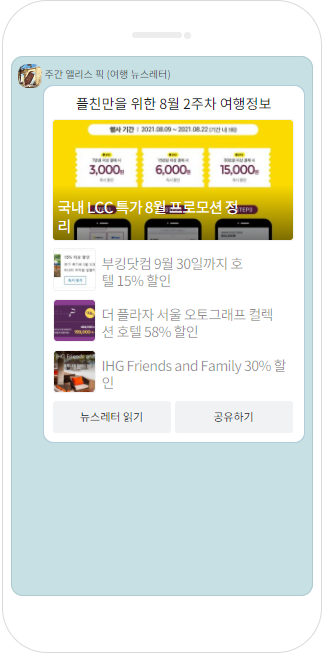 ① 주 1회 뉴스레터 + ② 주 1회 여행 프로모션 이렇게 카톡 플친으로 발송됩니다