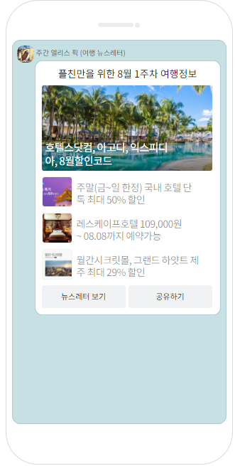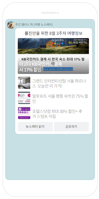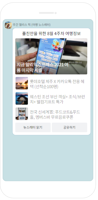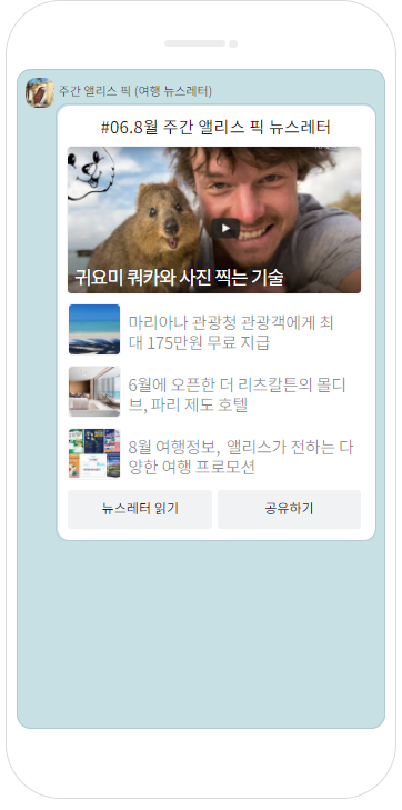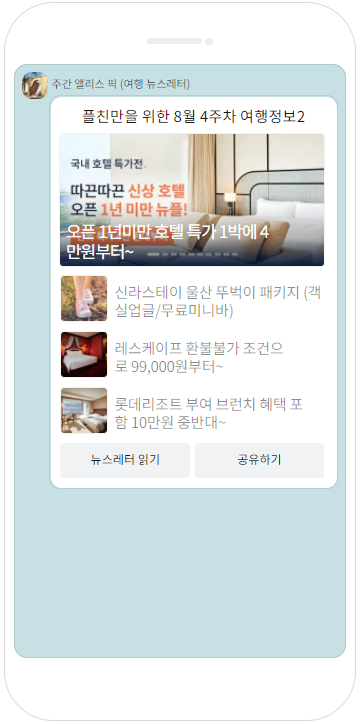 ① 주 1회 뉴스레터 + ② 주 1회 여행 프로모션 이렇게 카톡 플친으로 발송됩니다
