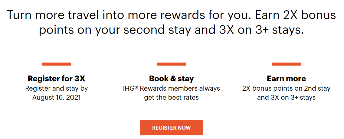 이벤트 기간 내 2회 숙박에 포인트 2배, 3회 이상 숙박에 포인트 3배 추가로 적립받을 수 있는 이벤트다. 물론 IHG 클럽에 가입해야하며(무료) 이벤트 오퍼에 등록(역시 무료)을 해야 한다.