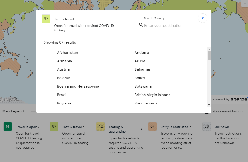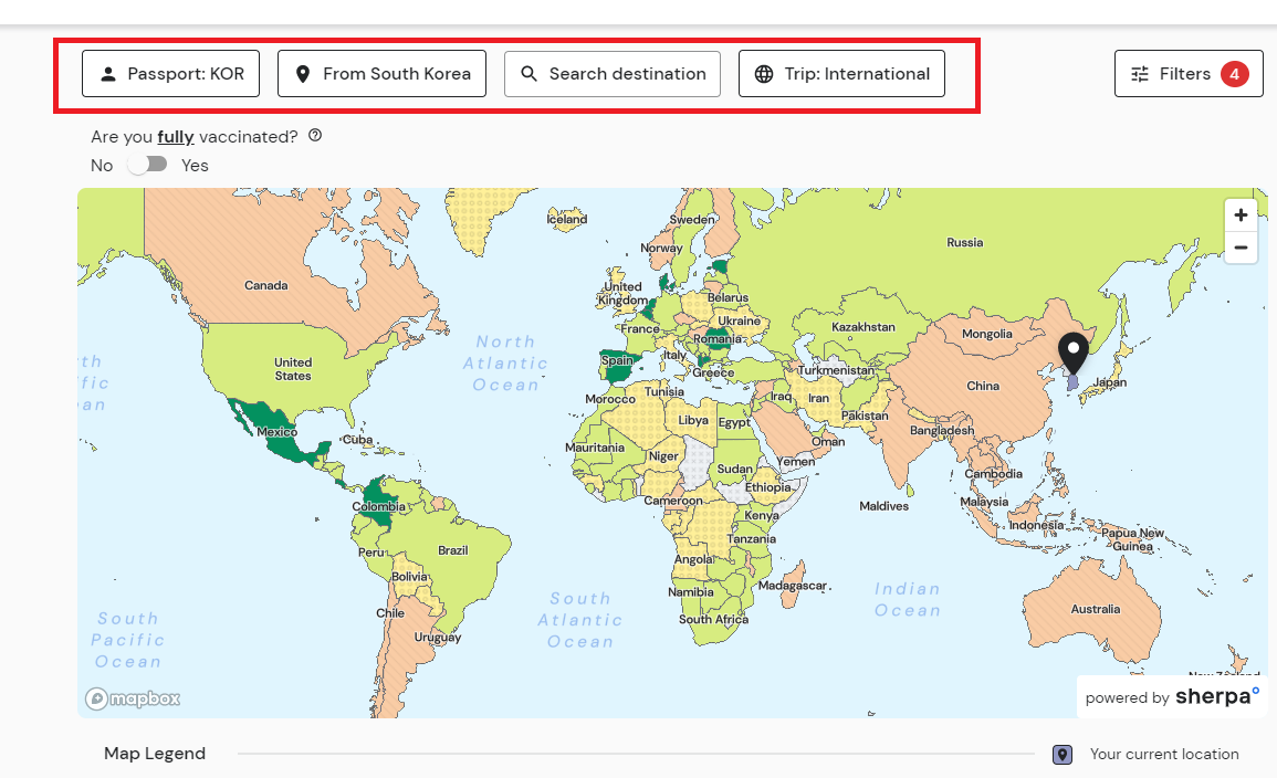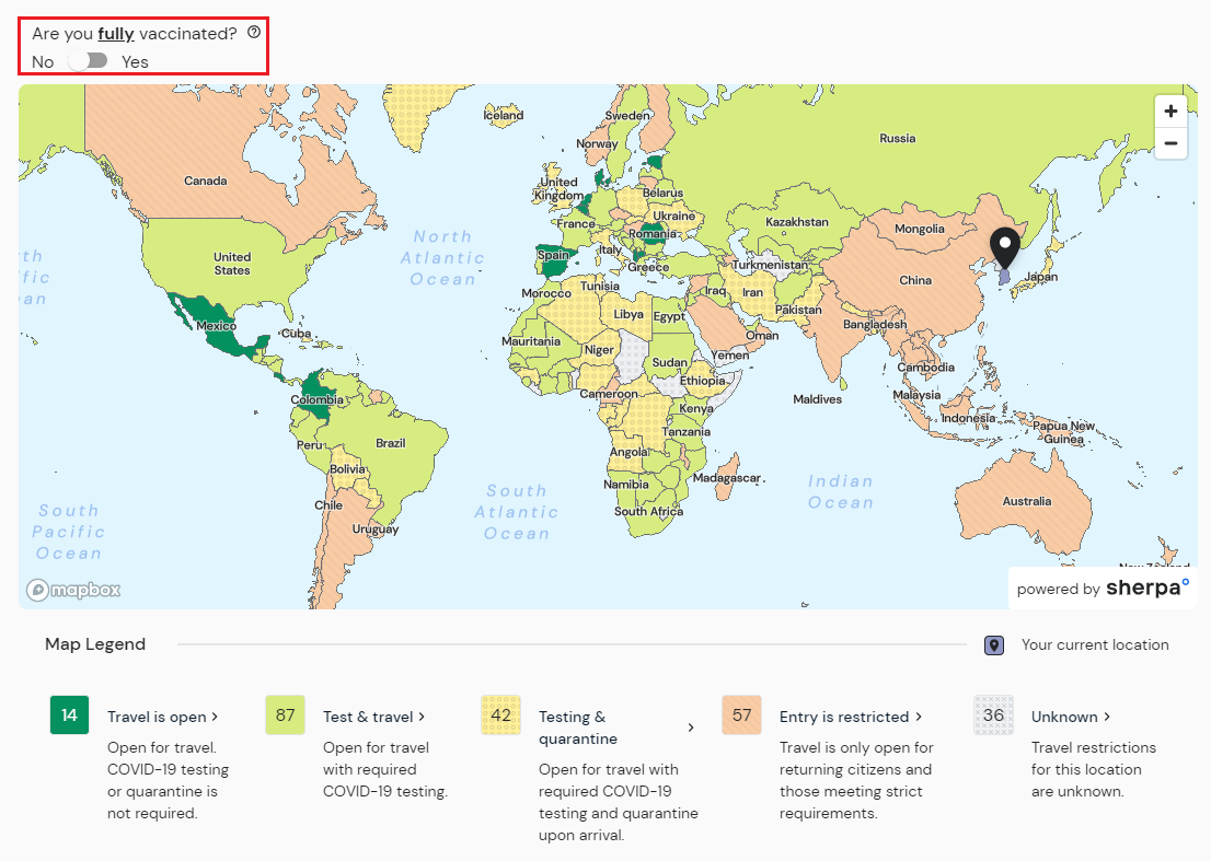이 또한 Sherpa에서 제공하는 서비스 중 하나로, 자신이 어떤 국가의 여권을 소지했으며, 백신 접종 여부에 따라 전세계 입국 가능 국가와 입국가능하다면 조건은 무엇이 있는지 알 수 있는 페이지가 있다. 워낙 직관적으로 잘 만든 세계지돌 한 눈에 조건과 국가들이 보인다는 장점이 매우 크다.