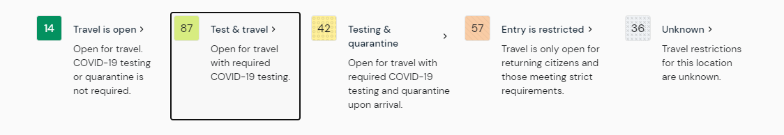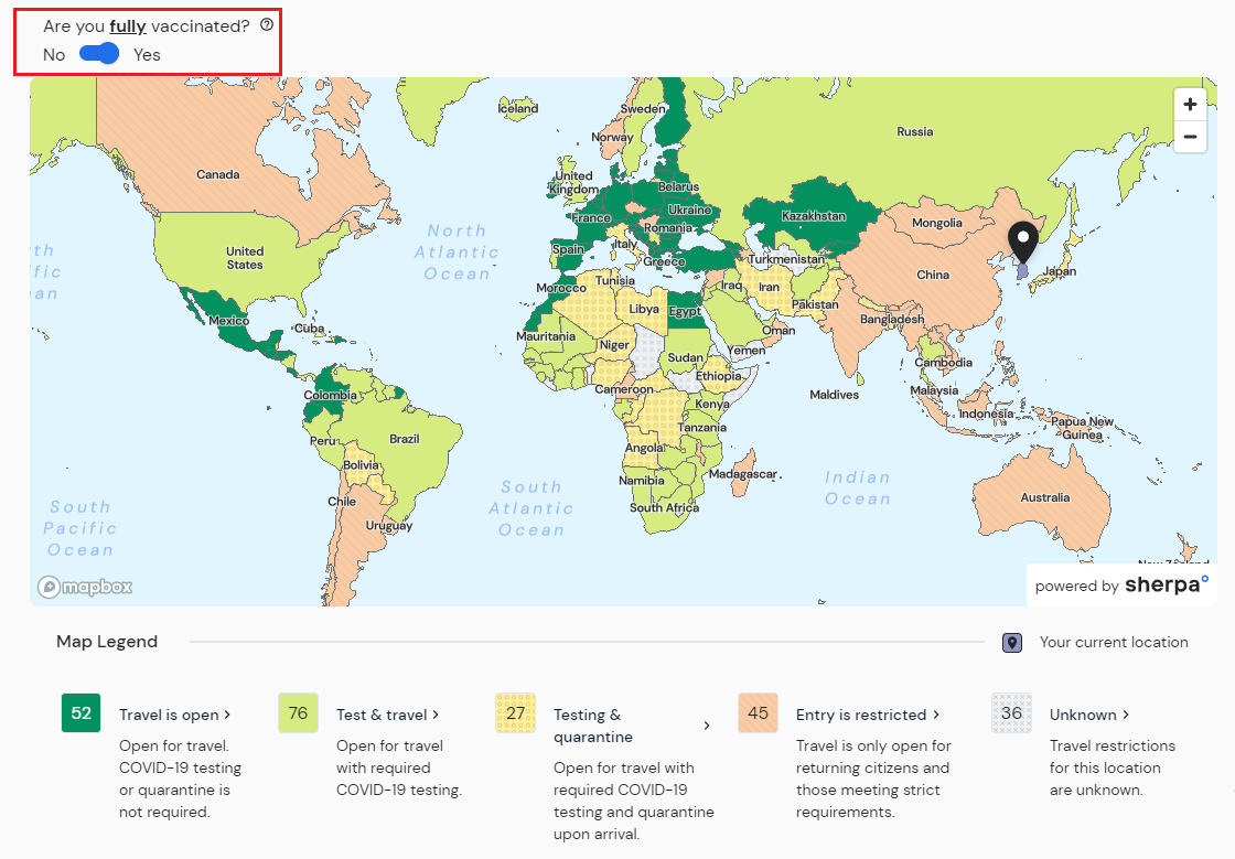 여기에 백신 접종에 대한 완료 여부를 확인하면 입국가능국가와 조건등을 한 눈에 알 수 있다. 초록색으로 표시된 국가가 PCR 진단서가 필요없거나 딱히 조건없이 입국 가능한 국가의 표시다. 연두색 표시는 입국은 가능하나 PCR 진단을 요구한다. 노란색 역시 입국은 가능하지만 현지 도착하자마자 PCR 진단은 물론 추가 방역 조건이 필요하다. 그외 표시는 입국 조건이 더 까다롭거나, 아직 정보가 없거나.